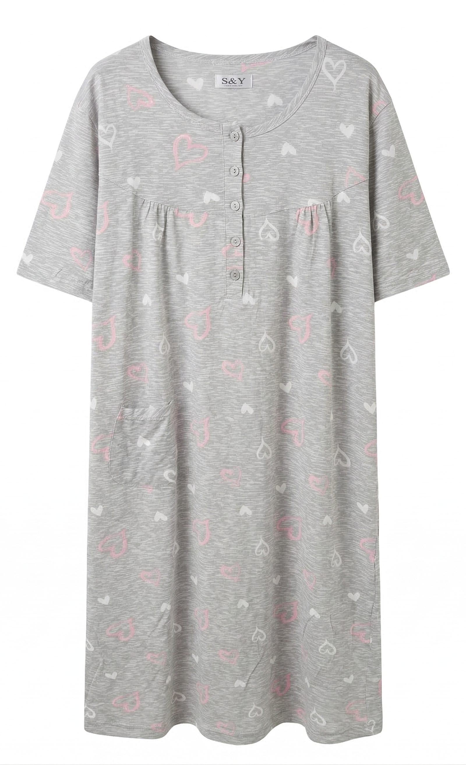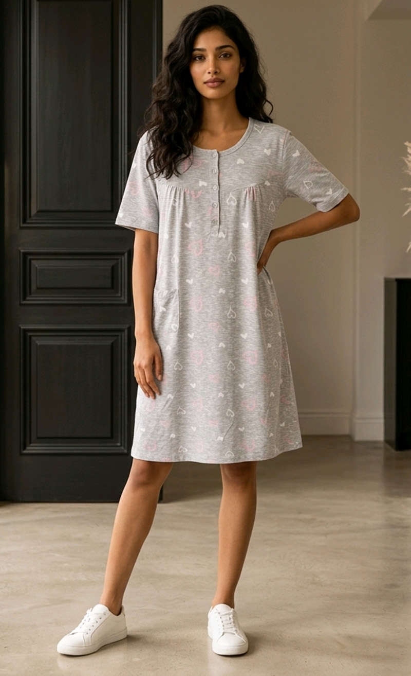 Grau-meliertes Nachthemd mit verspieltem Herz-Print. Bequemer Kurzarm-Schnitt, Knopfleiste am Ausschnitt und praktische Seitentasche für maximalen Komfort.